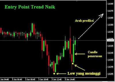 Trend naik dapat dideteksi dengan munculnya candle bullish penerusan berbadan panjang setelah grafik membetuk low yang meninggi